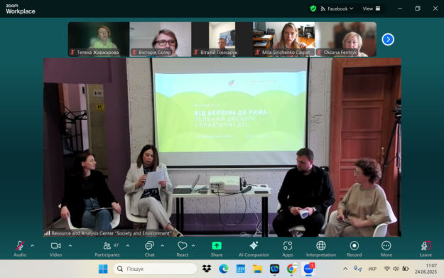 На засіданні національного круглого столу «Від Берліна до Рима: зелений дискурс і практичні дії», організованого Ресурсно-аналітичним центром «Суспільство і довкілля» за підтримки Heinrich-Böll-Stiftung Ukraine, голова ГО «Екосенс» Тетяна Жавжарова представила кейс із підготовки “Зеленої книги відновлення Запоріжжя” та досвід із впровадження принципів зеленої відбудови на практиці.