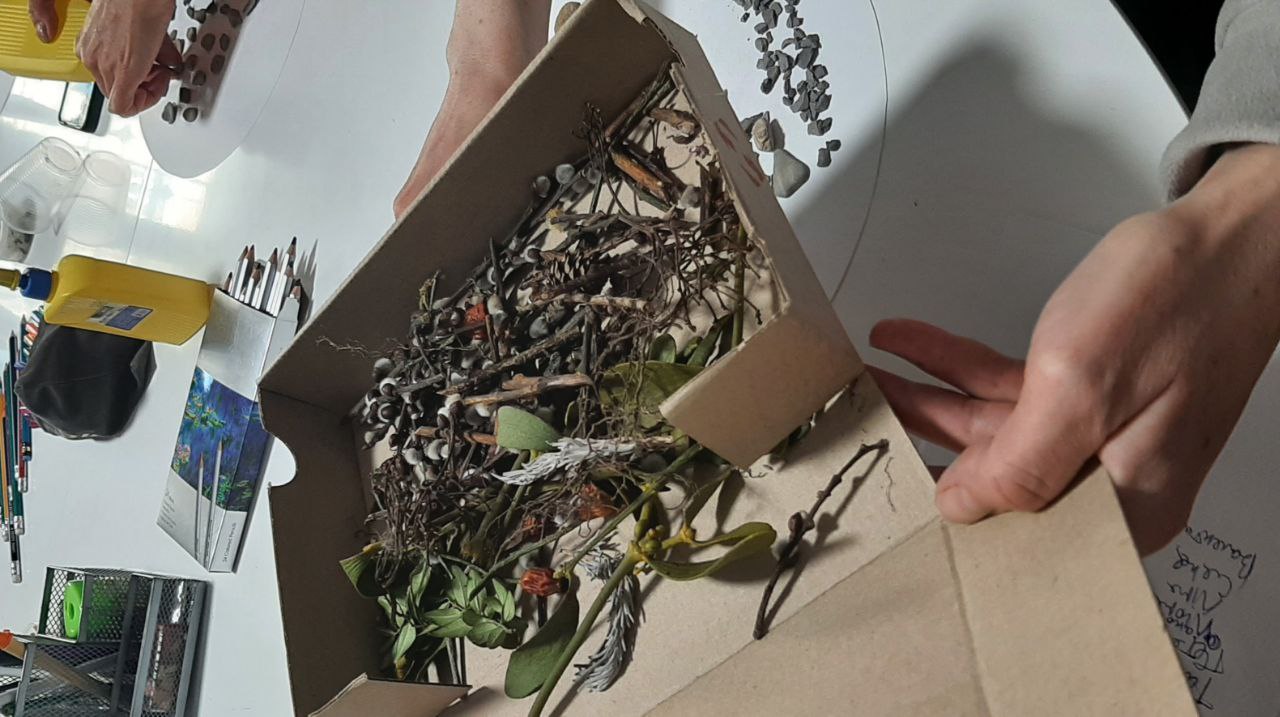 Для вправи “Моя улюблена місцина” дбайливо заздалегідь збираю зайві «жирові» чи загусті гілочки (їх багато після обрізки дерев) та інші природні матеріали. Це приклад роботи на стику психології та екології. Це спогади, які можуть бути ресурсом, а можуть заважати нашому руху, обтяжувати, якщо, наприклад, ситуація не прийнята, а горе не відгорьовано.