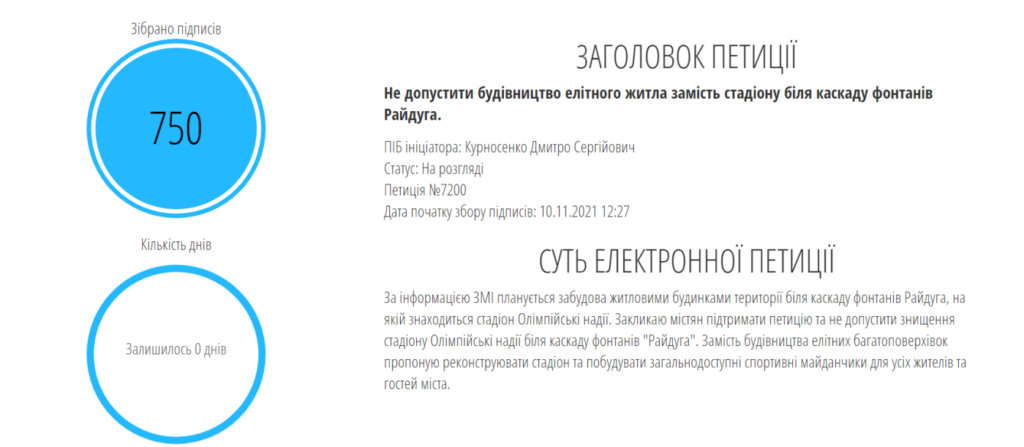 Враховуючи зміни цільового призначення земельної за ініціативою Дмитра Курносенко 10 листопада 2021 року створена петиція № 7200 про не допуск будівництва елітного житла замість стадіону біля каскаду фонтанів Райдуга. Ця петиція швидко набрала 750 підписів та мала бути винесеною на розгляд сесії Запорізької міської ради.