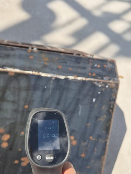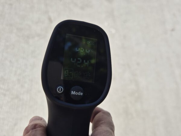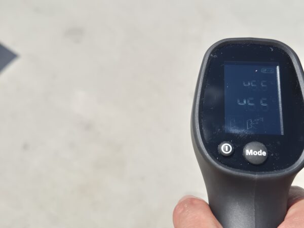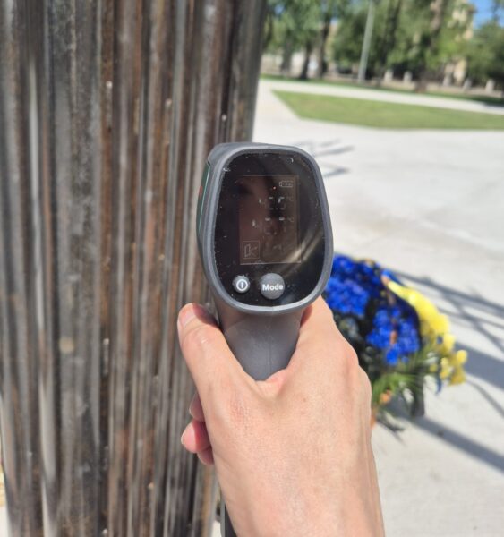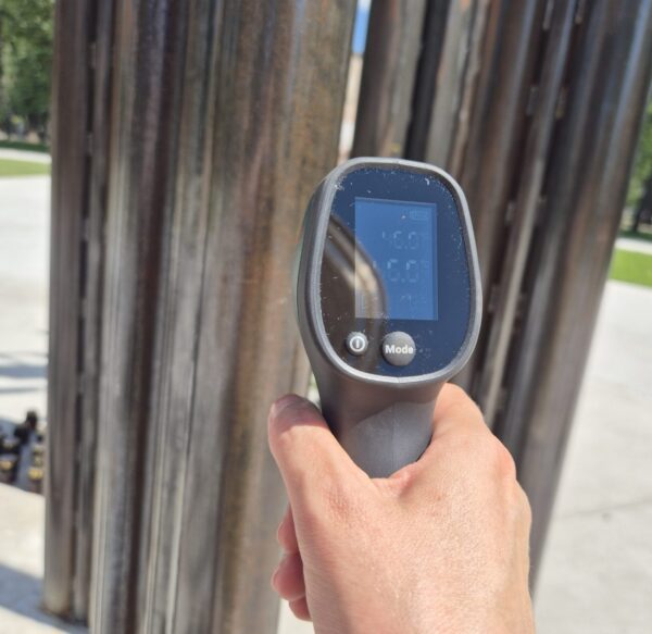 Результати фіксують суттєву різницю між типами покриттів та об’єктами: бетонне покриття під прямим сонцем прогрівалося до +46,6°C, у тіні дерева – до +42,4 °C. Навіть у затінку температура поверхні бетону значно перевищує комфортні для перебування значення. Штучні наземні світильники, розташовані по колу, нагрівалися ще сильніше – від +54°C до +60,5°C, залежно від розташування. Металеві труби різного діаметра, з яких створено інсталяцію «Дерево Пам’яті», в цей час мали температуру від +42,7°C до +46°C.