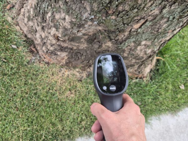 Продовжуючи серію спостережень, представниці ГО «Екосенс» 24 липня провели вимірювання температур поверхонь навколо меморіалу «Дерево Пам’яті» в парку Металургів імені В.Сацького. Експериментальні вимірювання тривали з 12:00 до 14:00, коли температура повітря в тіні становила +33 °C за слабкої вітряності.