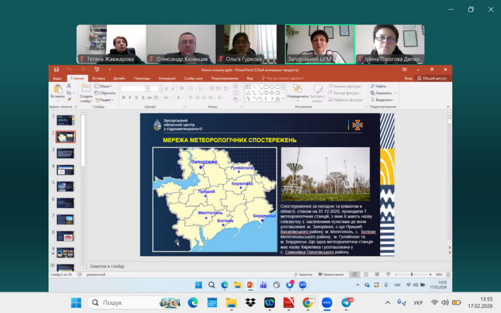 Під егідою Департаменту захисту довкілля Запорізької обласної державної адміністрації відбулося засідання робочої групи для розробки дорожньої карти проєкту «Адаптація Запорізької області до наслідків зміни клімату: розроблення документів державного планування на регіональному рівні». До її складу увійшли не лише науковці та галузеві експерти, а й представники громадського сектору, що засвідчує відкритість процесу та увагу до голосу мешканців регіону.